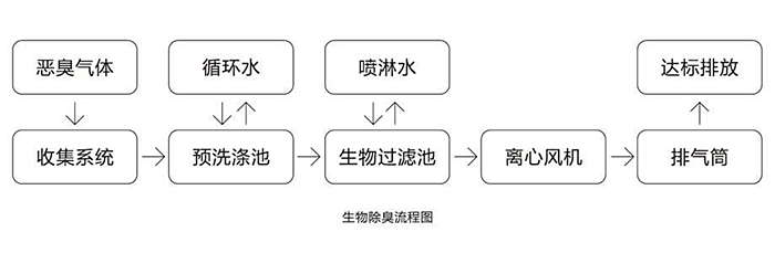 惡臭氣體經(jīng)過管道收集后進入生物過濾除臭裝置,氣流與循環(huán)液在穿過生物填料層的過程中完成生物的氣液擴散、液固擴散、生物氧化三個過程,生物填料表面生物膜中的微生物以惡臭氣體物質(zhì)為營養(yǎng),惡臭物及VOCs被微生物氧化分解,在轉(zhuǎn)化過程中產(chǎn)生能量,為微生物的生長與繁殖提供能源,使惡臭氣體物質(zhì)的轉(zhuǎn)化持續(xù)進行,經(jīng)凈化后的氣體由引風(fēng)機引出排放。