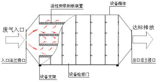廢氣經(jīng)過吸附塔內(nèi)的初效過濾器除去固體顆粒物后,進(jìn)入塔體,經(jīng)過活性炭層吸附后,除去氣體中的有機(jī)廢氣分子,達(dá)到符合排放標(biāo)準(zhǔn)的凈化氣體,經(jīng)風(fēng)機(jī)排到室外。